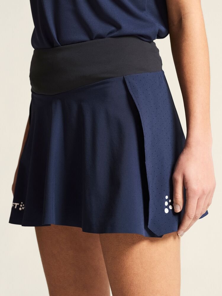 Der Ability Skirt ist ein hoch funktioneller Spiel- und Trainingsrock speziell für Schlägersportarten wie Tennis und Padel. Der Rock besteht aus einem funktionellen und elastischen Polyestergewebe, das einen hervorragenden Feuchtigkeitstransport und Bewegungsfreiheit bietet. Innentights mit einer elastischen Power-Mesh-Tasche an jedem Bein ermöglichen die sichere Aufbewahrung von Tennisbällen während intensiver Ballwechsel. Darüber hinaus verfügt der Rock über perforierte Belüftungsöffnungen auf der Rückseite für eine bessere Luftzirkulation und einen breiten Bund für optimalen Komfort. Perfekt für das Branding mit Vereins-, Sponsoren- oder Firmenlogos.