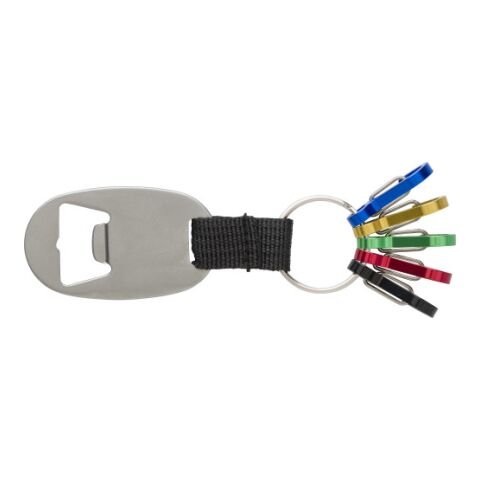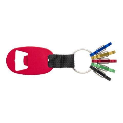 Schlüsselanhänger ‘Usedom’ aus Aluminium, mit Flaschenöffner, Polyester-Band, Schlüsselring und fünf kleinen Karabinerhaken in fünf verschiedenen Farben (blau, rot, gold, grün und schwarz).